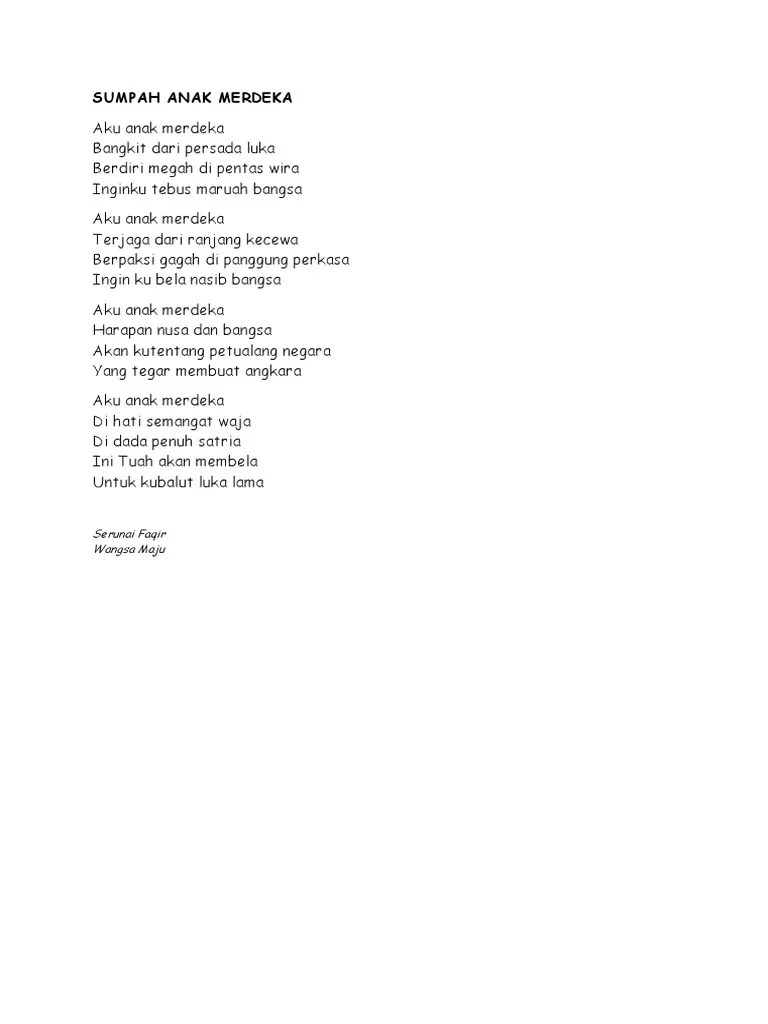 Sajak aku anak merdeka sumpah anak merdeka aku anak merdeka bangkit dari persada luka berdiri megah di pentas wira inginku . Sumpah anak merdeka aku anak state of nine fans club son facebook . Berdiri megah di pentas wira. Berdiri megah di pentas wira.